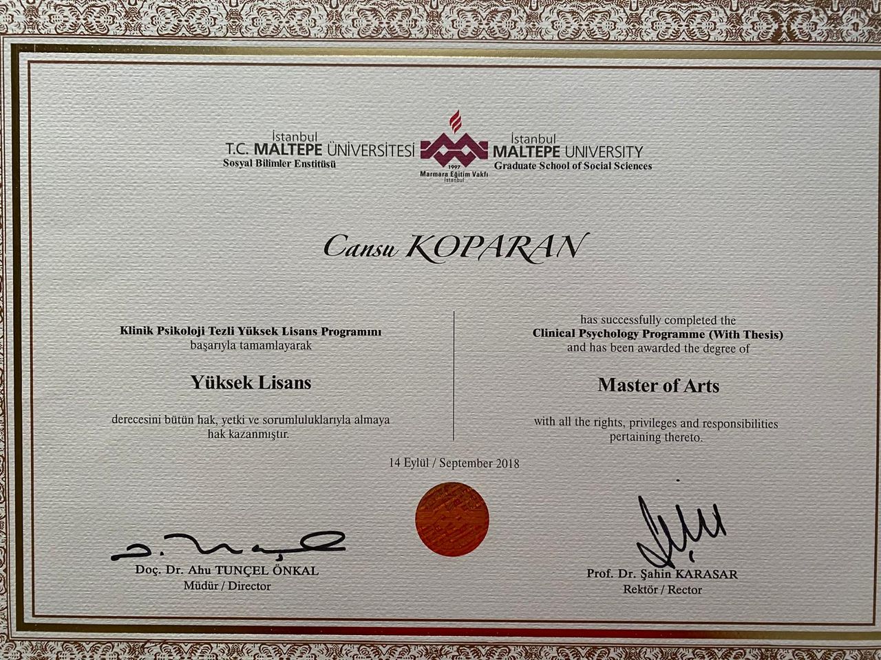 - Maltepe Üniversitesi (Klinik Psikoloji-Yüksek Lisans)