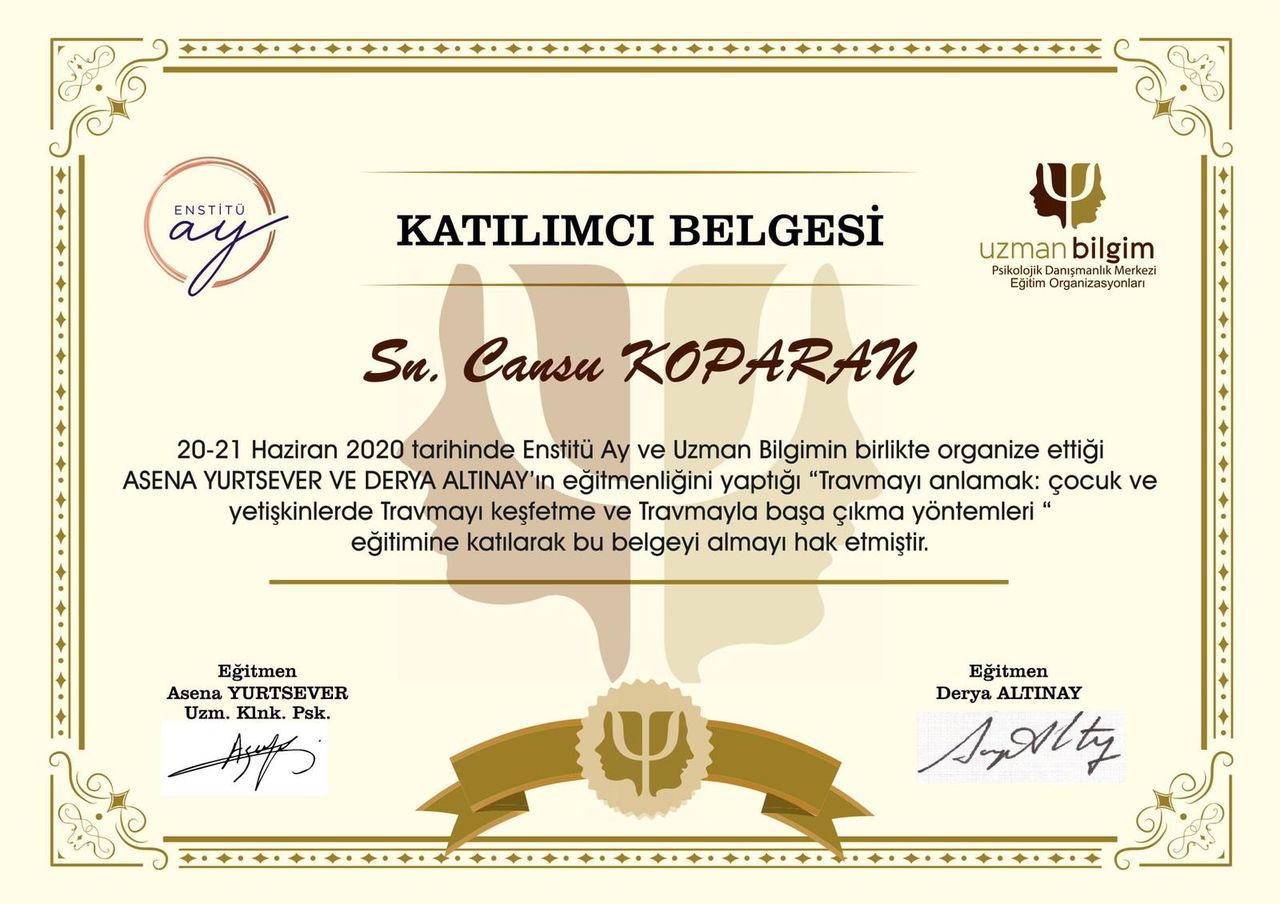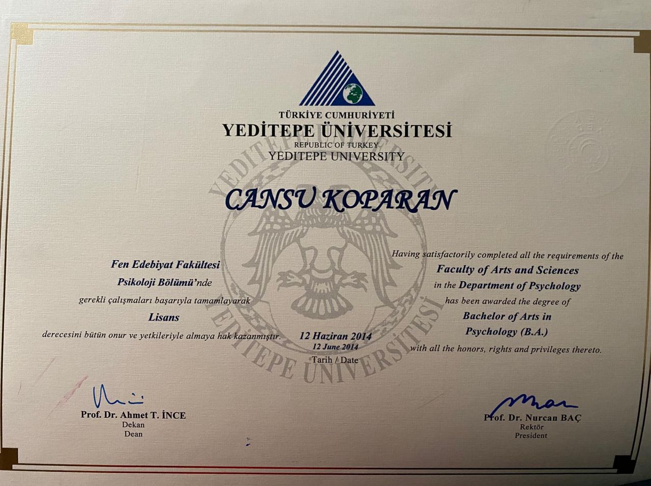 Uzm. Kl. Psk. Cansu Koparan, Yeditepe Üniversitesi'nde Psikoloji lisans eğitimi almıştır.