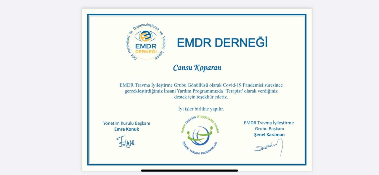 - EMDR Sık Kullanılan Protokoller Eğitimi ( Yas, Dürtü Kontrolü, Kısa Süreli Performans Geliştirme ve Somatik Bozukluklar Protokolleri)